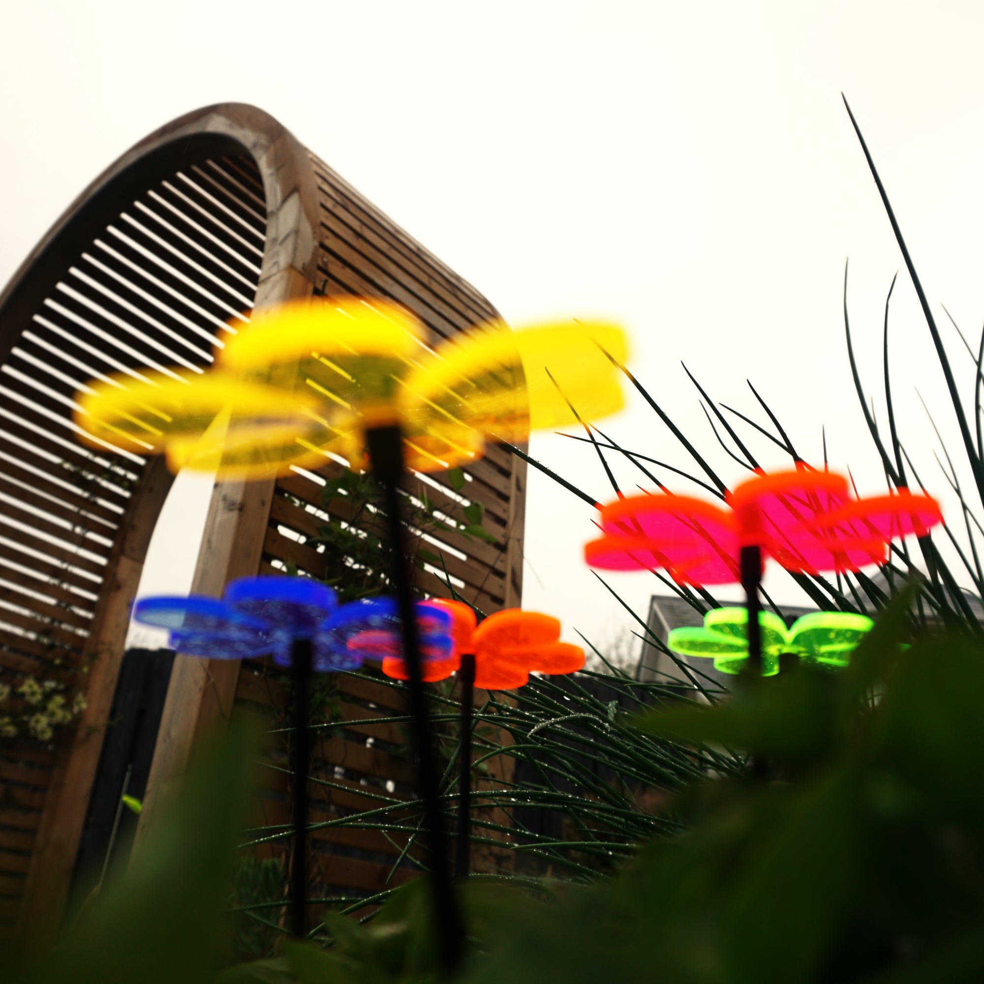This Set of 5 SunCatchers ‘Daisy’ consists of:- a five wide, glowing light collector in red, orange, yellow, green or blue – five 25cm long, black swing rod,- matching support rings and end caps. Planted it is about 20cm high and looks great in your flower bed or pot.